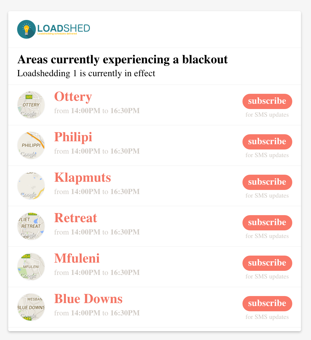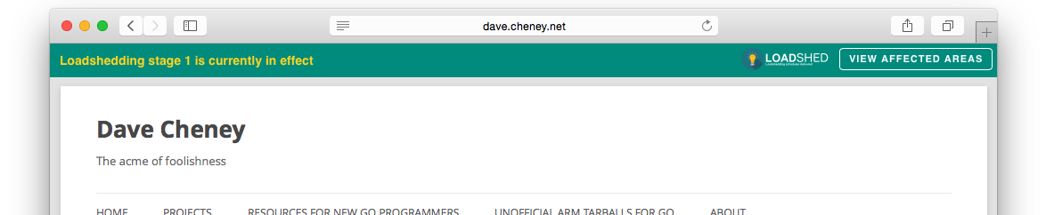 When loadshedding is taking place there is often a large percentage of users who hit the web in hopes to find out where loadshedding is currently taking place. In a effort to help all local websites we've started building widgets that integrate with the our loadshedding schedules. This allows any website/blog to install widgets that inform users, in a non-intrusive way, about the current loadshedding status.